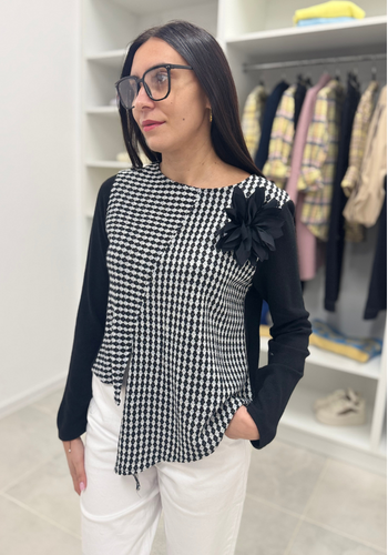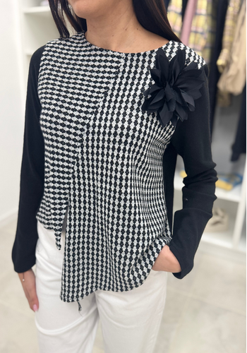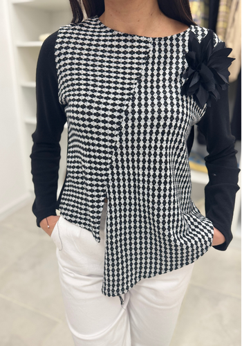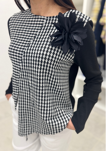 Modna bluzka damska z długim rękawem ozdobiona broszką typu kwiat po lewej stronie. Model pod szyje oraz posiada przeszycie przez środek i wiązanie po prawej stronie.