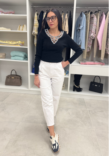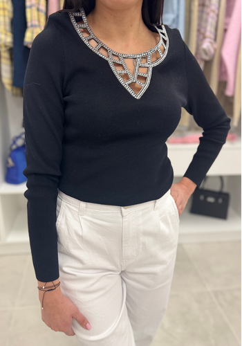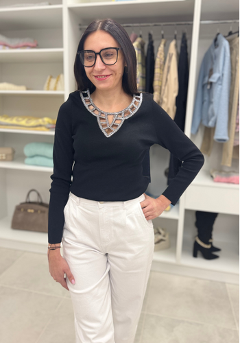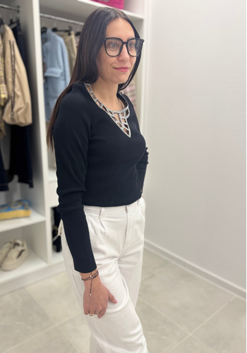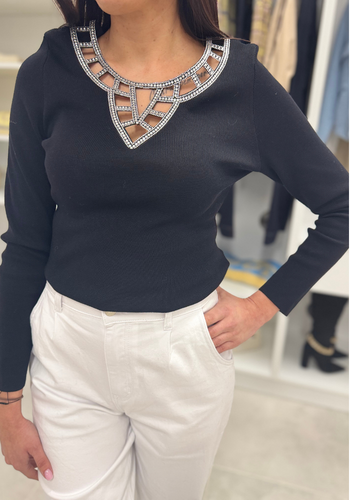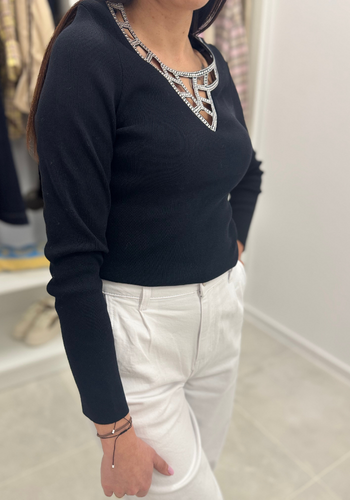 Prążkowa czarna bluzka ze srebrnym dekoltem