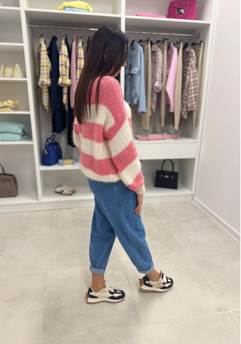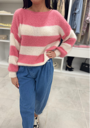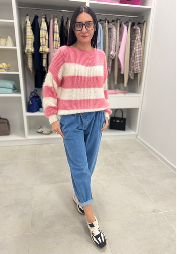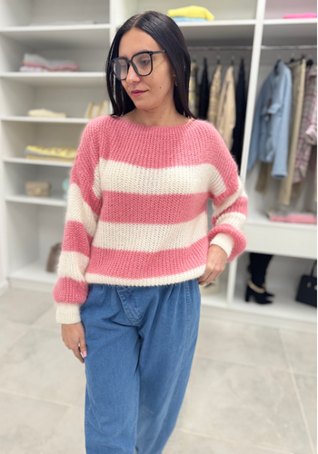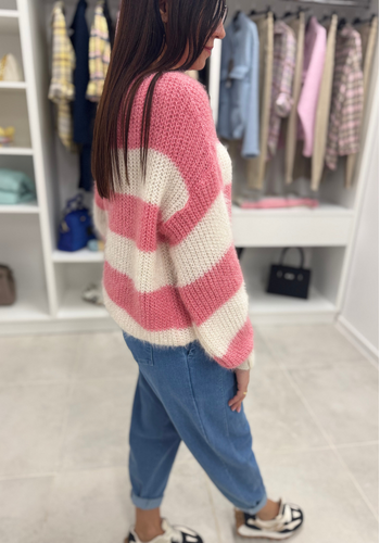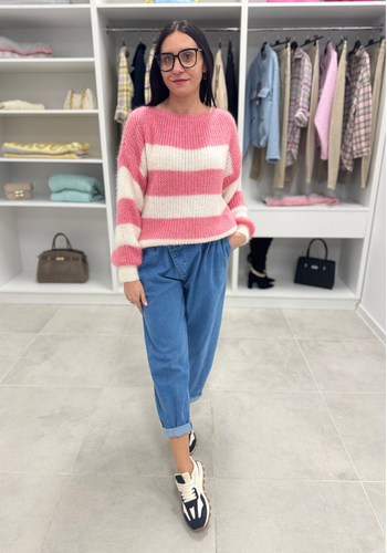 Miękki, elegancki sweterek z długim rękawem. Jego głównym zdobieniem paski. Wystepuje w kolorystyce; beżowo-czarnej, biało-różowej, biało-zielonej. Model świetnie sprawdzi się do wielu stylizacji.