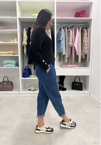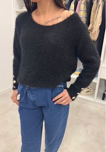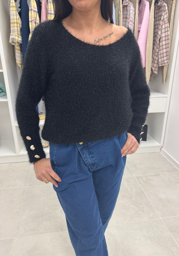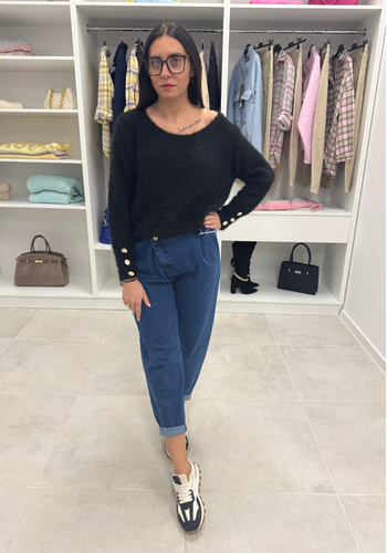 Miękki, elegancki sweterek z długim rękawem. Jego głównym zdobieniem są trzy złote guziki przy rękawie, dodatkow posiada dekolt w V. Wystepuje w kolorystyce; beżu, bieli, czarnego i błękitu. Model świetnie sprawdzi się do wielu stylizacji.